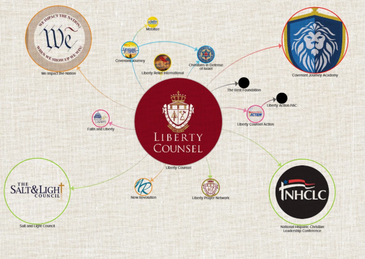 WWW.UNCLOSETEDMEDIA.COMLiberty Counsels Deep Network of Far Right Faith and InfluenceScreenshots via each respective groups website. Designed using Kumu.io.Liberty Counsel, the legal group representing Kim Davis latest push for the Supreme Court to overturn gay marriage, wants to reshape American society in a far-right Christian imageone in which LGBTQ people are excluded. Theyve been fighting LGBTQ rights for years, from Lawrence v. Texas to Proposition 8 to Obergefell. Along the way, theyve claimed that gay people know intuitively that what they are doing is immoral, unnatural, and self-destructive and that they are not controlled by reason, but rather by lust.While the brunt of their work focuses on right-wing litigation, their efforts dont stop there. An Uncloseted Media investigation has uncovered that Liberty Counsel operates as an umbrella organization that has either founded or heavily supported a large network of affiliated organizations working to pursue far-right Christian politics by influencing key American institutions.What I compare it to are gears in a machine, and each one serves a different purpose, Anne Nelson, author of Shadow Network: Media, Money, and the Secret Hub of the Radical Right, told Uncloseted Media.These groups use education to spread far-right Christian doctrine, they galvanize churches to become activist hubs and they work behind the scenes to influence Supreme Court justices and other government officials.All of these groups, many of which are frequently referred to as ministries, share the enthusiastic support of Liberty Counsel founder Mat Staver and the common goals of fighting against LGBTQ rights, cracking down on abortion, influencing American law and politics and more.This array of ministries reflects the varied fronts in the religious rights war against LGBTQ Americans and our freedom, says Peter Montgomery, research director at People for the American Way, an advocacy group aimed at challenging the far right. He says that this network strategically works in tandem to drum up support among congregations and conservative women and to influence American media, courts and schools. To make sense of these dizzying connections, we spoke with key experts and we dug into the groups that are part of Liberty Counsels expansive network. Heres what we found about each of them:1. Liberty Counsel ActionScreenshot from Liberty Counsel Action.Liberty Counsel Action is a companion to Liberty Counsel. While the two groups are formally distinct and have slightly different leadership, Mat Staver is chairman for both groups, and they have very similar website architecture. The primary distinction is that Liberty Counsel is registered as a 501(c)(3) nonprofit, a designation for religious and charitable organizations, while Liberty Counsel Action is a 501(c)(4), a designation for social welfare groups. While the designations are similar, donations to 501(c)(3) organizations are tax-deductible, but the groups cannot endorse or donate to political campaigns. Meanwhile, donations to 501(c)(4) organizations are not tax-deductible, but they can donate to and endorse candidates.Liberty Counsel founder and chairman Mat Staver speaking at the Values Voter Summit in Washington, D.C. Photo by Gage Skidmore.Montgomery says its a fairly common strategy for organizations to maintain different groups like this. While Liberty Counsel is able to bring in more money due to tax incentives for donors, Liberty Counsel Action can freely engage in political advocacy.Some of the groups campaigns include fighting the Equality Act and calling for Congress to investigate pro-Palestinian student organizations. One of their initiatives this year has been drafting Abortion in Our Water, a report that outlines how abortion pills are polluting U.S. water supplies, a claim that environmental scientists have rejected. Theyre also currently pushing for Republicans not to cave to the Schumer Shakedown, a nickname theyve used for the ongoing government shutdownFor more direct political action, Liberty Counsel Action also had a super PAC which spent nearly $70,000 on opposing Barack Obamas reelection.Montgomery says having these different branches allows Liberty Counsel to achieve more diverse control in politics and the law.Some of [their goals] they can achieve through the courts, some of it is gonna be through political advocacy. So then you start an advocacy affiliate, and then you start a PAC because you want to elect people who can help you get this vision of the country, he says.2. Faith and LibertyScreenshot from Faith and Liberty.Founded in 1995, Faith and Libertyoriginally named Faith and Actionis a Washington, D.C. based Christian ministry that has historically courted Supreme Court justices and other government officials behind closed doors. The groups former president, Rev. Rob Schenck, decided to leave the Christian right in 2016 after the movements embrace of then-candidate Donald Trump compounded his growing doubts about the ideology.MAGA I dont even define as Christianity anymore, Schenck told Uncloseted Media. Its an apostasyits a defection from the Christian faith. It is, in fact, the diametric opposite of what Jesus taught and modeled.Schenck says that the group would host dinners, prayers and other meetings with conservative politicians and Supreme Court justices including Clarence Thomas, Samuel Alito and the late Antonin Scalia, where they would encourage the justices to adopt more radical rhetoric and policies.We would tell [the justices] over and over again: The people love you when you are bold and uncompromising and unapologetic, so be strongwe are with you, were behind you, Schenck says, adding that his former organization was internally nicknamed the Ministry of Emboldenment.Other activities of the ministry included outreach to young people at colleges and youth programs with an eye toward recruiting future right-wing political and judicial figures. This included hosting eve